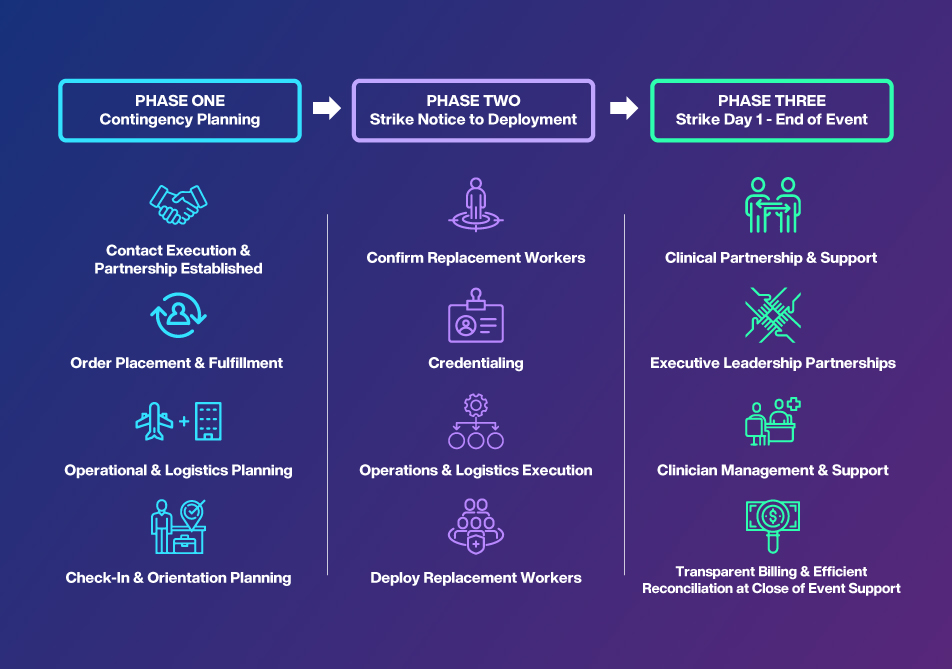 Our extensive experience with a wide variety of strike situations—large or small, nurse or allied, one day or indefinite—allows you to leverage our expertise to craft your ideal outcomes.